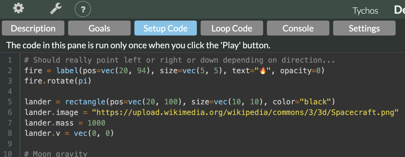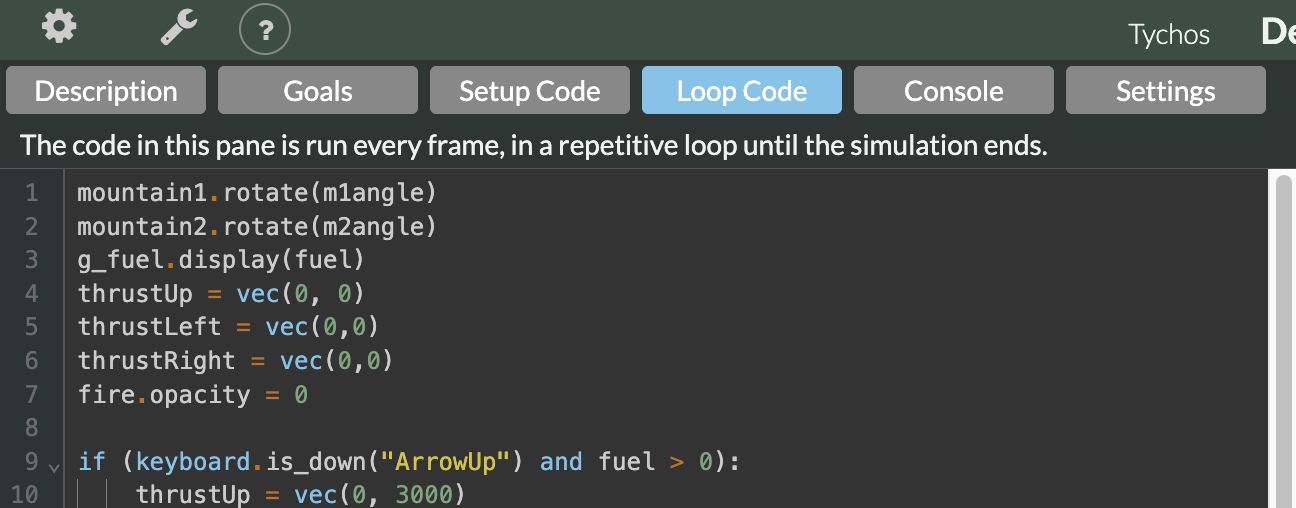 For more on Goals, and how to write them, please visit [Writing Goals (Python)](https://docs.tychos.org/docs/for-teachers/writing-goals) or [Writing Goals (MathJs)](https://docs.tychos.org/docs/for-teachers/writing-goals-1).