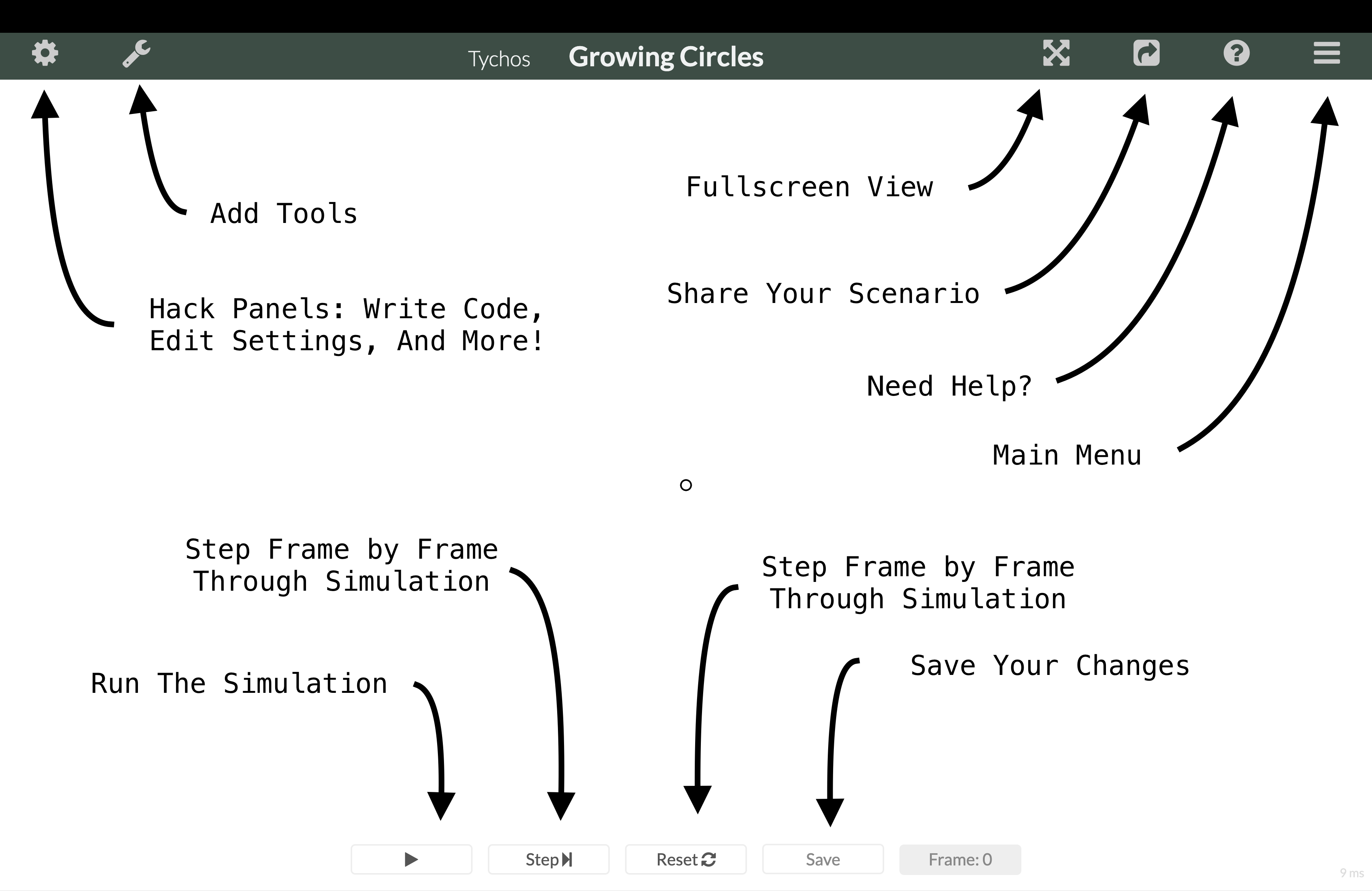 6. **Simulation Controls** - these are the controls for running (or pausing), stepping through, or saving your simulation.